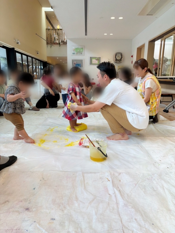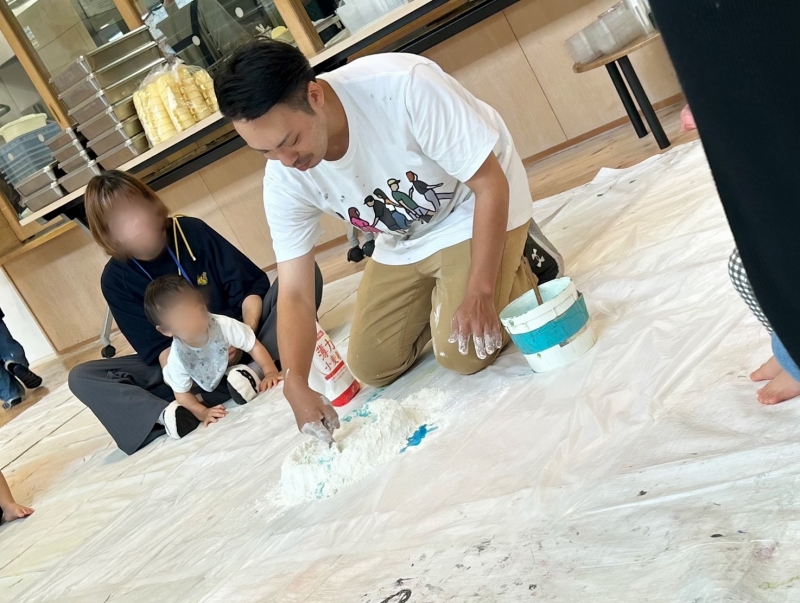 今回のパートナー保育では小麦粉粘土で遊びました!目の前で造形の先生が粘土作りを実演してくれると、真っ白でさらさらな小麦粉がだんだん固まってくる様子に最初は不思議そうに、ちょっと怖がって見ていた子ども達でしたが…だんだん興味が湧いてきたようで、指で触れたり、伸ばしてみたり、裸足でペタペタ踏んでみたりと感触を楽しんで遊ぶ姿が見られ、楽しいひとときを過ごすことが出来ました。