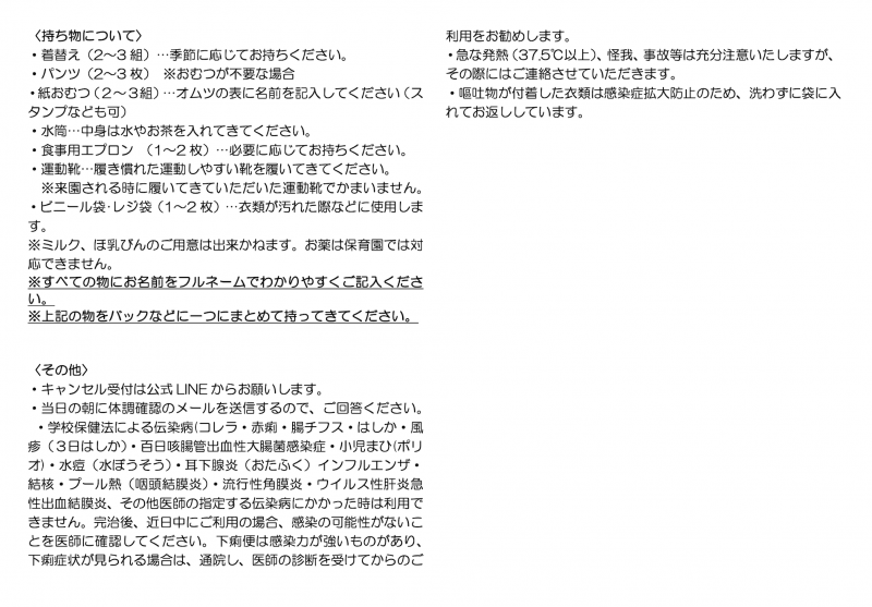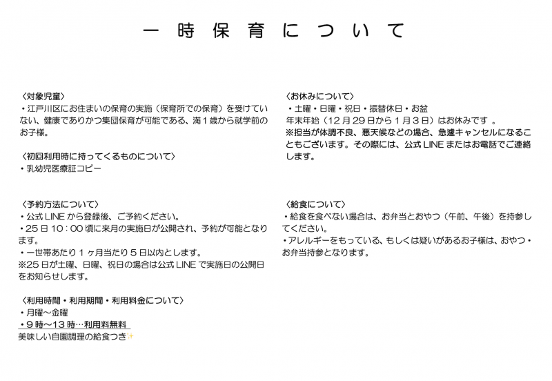 4月からの一時保育の利用が無償化になりました。予約は公式LINEから登録後、可能になります。4月の一時保育の予約は3/25(水)10:00~となります。